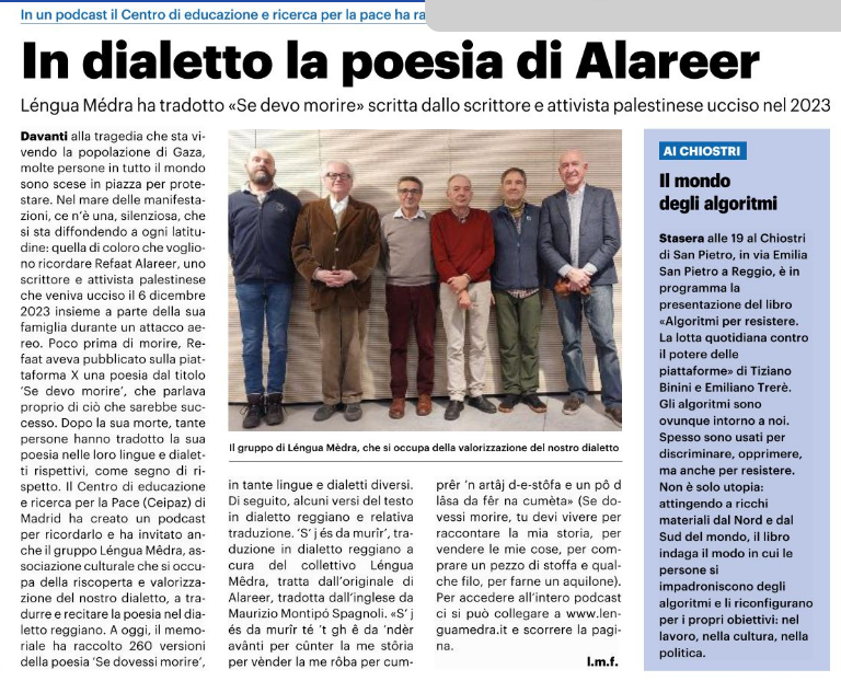 Il quotidiano Il Resto del Carlino racconta come Léngua Mêdra sia stata coinvolta dal Ceipaz di Madrid per portare il contributo in dialetto reggiano nella traduzione di una poesia di Refaat Alareer, scrittore e poesta palestinese, morto nel 2023 con la sua famiglia durante un bombardamento. La poesia in reggiano è presente assieme a oltre 260 traduzioni da tutto il mondo.